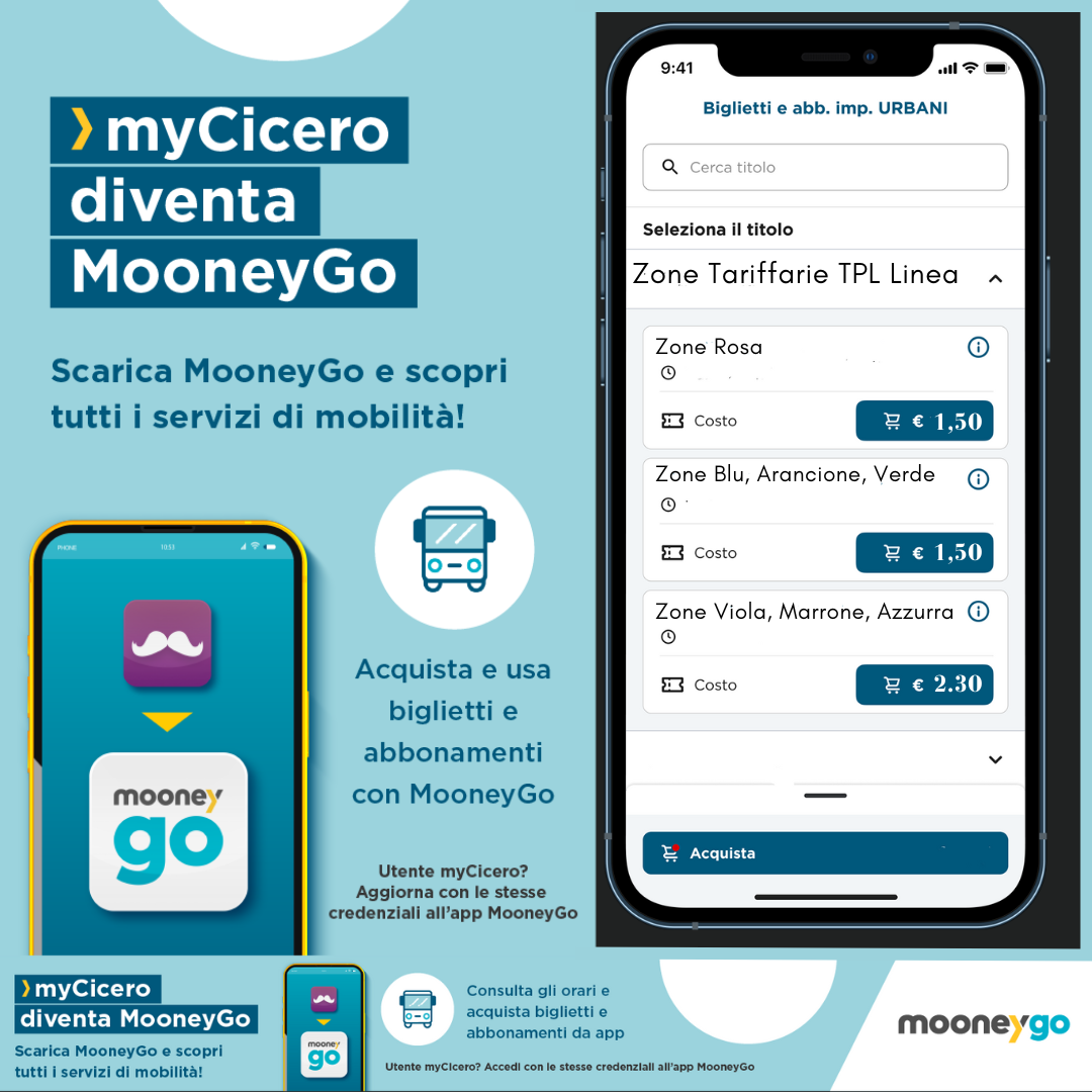 Nell’ambito del continuo processo di digitalizzazione dei servizi e degli acquisti online di titoli di viaggio e abbonamenti mensili o annuali, TPL Linea informa l’utenza che l’app “myCicero”, l’applicazione maggiormente utilizzata nel settore trasporti per ottenere comodamente dal proprio cellulare e smartphone la bigliettazione desiderata, ha cambiato nome: ora si chiama “MooneyGo”.