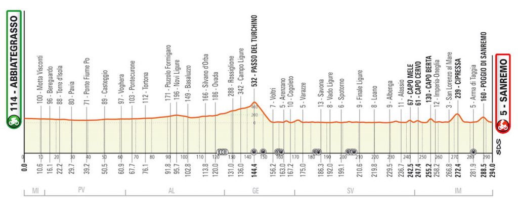 A discapito di una partenza “ritoccata” la Sanremo è e rimane la corsa più lunga della stagione con i suoi 294 chilometri. L’accento inedito caratterizza anche la prima parte del percorso che si ricongiunge al tracciato storico in prossimità di Pavia (km 29,7).