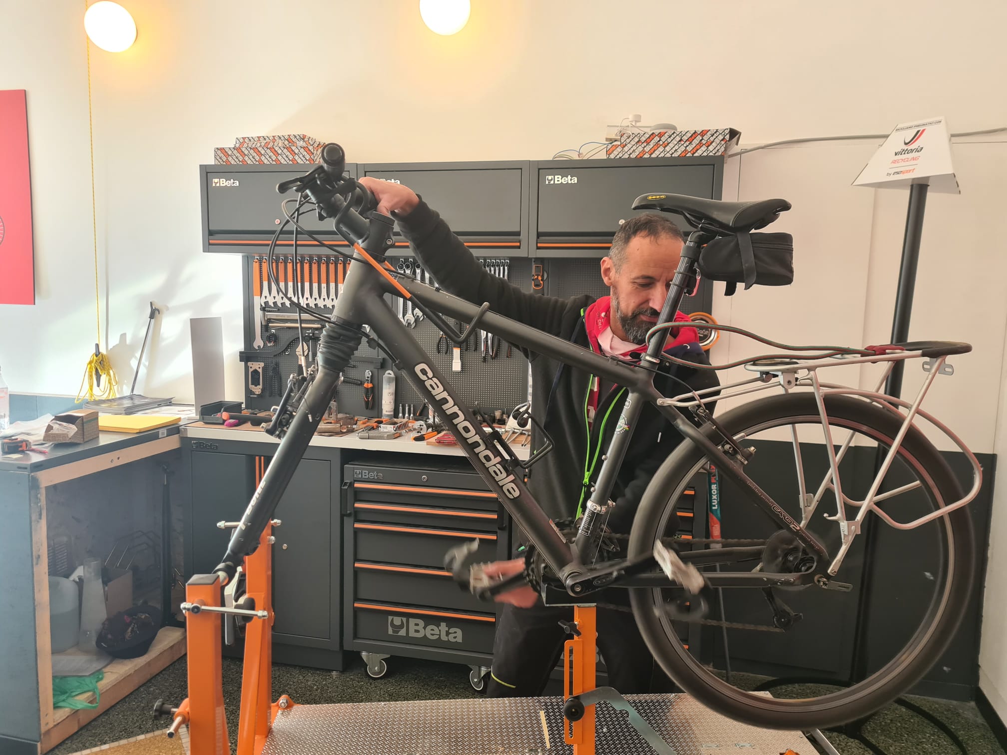 Ecco allora l’idea della ciclofficina sostenibile. Sostenibile perché anche attenta all’ambiente: «Ci stiamo interfacciando con dei partner tecnici che credono nella sostenibilità, come gli utensili Beta, ma anche Vittoria Pneumatici che tramutano i copertoni in altro come tappeti per bambini, tapis roulant eccetera. Poi la vasca lava pezzi si basa su detergenti bio con enzimi e batteri a ciclo chiuso senza nessun sversamento nell’ambiente con il riciclo da parte della stessa azienda che li fornisce», chiarisce Bianchi.