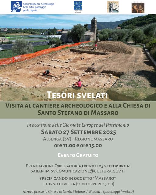 Parte della visita sarà infatti anche lo scavo archeologico avviato in Regione Massaro ad Albenga a partire dal mese di luglio 2025 dalla competente Soprintendenza Archeologia Belle Arti e Paesaggio per la Liguria grazie a un finanziamento del Ministero della Cultura, che ha portato alla luce un insediamento rustico di età romana.Gli scavi, che proseguiranno ancora per circa un mese, permetteranno di comprendere l’estensione complessiva dell’edificio, la disposizione dei diversi vani e le funzioni che vi si svolgevano, nonché le diverse fasi di vita e di abbandono del sito. La visita all’area di scavo illustrerà i risultati delle indagini direttamente dalla voce degli archeologi che vi hanno lavorato