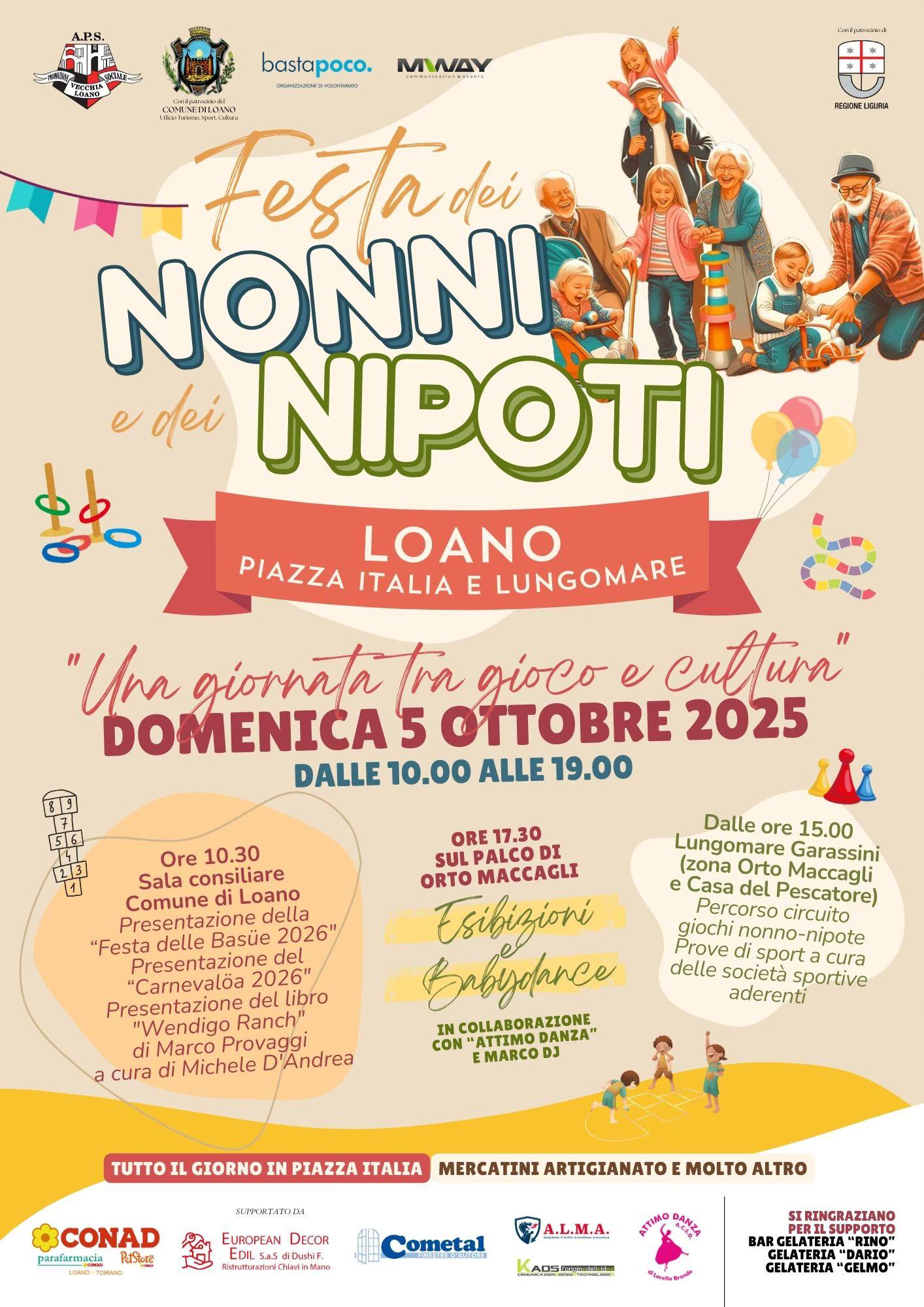 Domenica 5 ottobre si terrà la “Festa dei nonni e dei nipoti”, promossa da Vecchia Loano in collaborazione con Basta Poco Onlus e Mway Communication & Events e con il patrocinio dell'assessorato a turismo, cultura e sport del Comune di Loano. La giornata “tra gioco e cultura”, come sottolineano gli organizzatori, prenderà il via alle 10.30 nella sala consiliare di Palazzo Doria, con la presentazione dell'edizione 2026 della Festa delle Basüe e del Carnevalöa. A seguire la presentazione del libro “Wendigo Ranch” di Marco Provaggi, a cura di Michele D'Andrea.