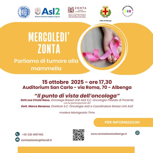 In occasione di “Ottobre, mese della prevenzione al tumore alla mammella”, lo Zonta Club Alassio- Albenga promuove un ciclo di quattro incontri itineranti dedicati alla prevenzione, alla diagnosi e alla cura del tumore al seno.