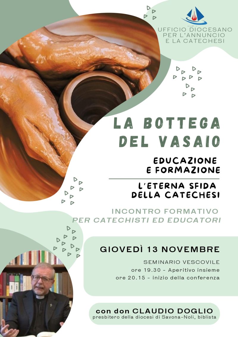 L’Ufficio catechistico diocesano informa che, dopo la piacevole serata della Festa dei Catechisti dello scorso sabato 4 ottobre, prosegue il percorso formativo di quest’anno con un incontro dal titolo “La bottega del vasaio: educazione e formazione, l’eterna sfida della catechesi”, che si terrà giovedì 13 novembre prossimo, presso il Seminario Vescovile ad Albenga.