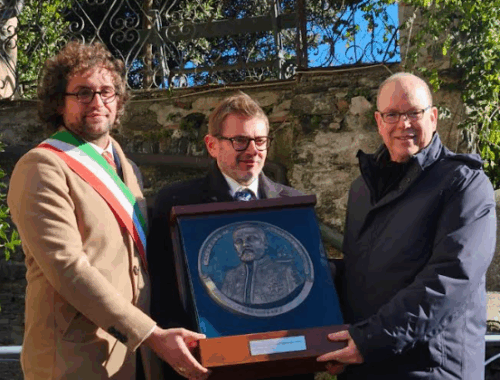 Lo scultore Pietro Marchese consegna un’opera al principe di Monaco in occasione dell’inizio dei lavori al castello di Stella San Giovanni