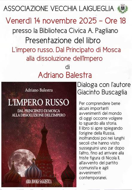 Venerdì 14 novembre, alle 18, presso la biblioteca civica Pagliano di Laigueglia, sarà presentato il libro “L’impero Russo. Dal principato di Mosca alla dissoluzione dell’impero” di Adriano Balestra, evento culturale organizzato nell’ambito della rassegna letteraria settimanale tenuta dall’Associazione Vecchia Laigueglia in collaborazione con il Comune di Laigueglia; dialogherà con l’autore Giacinto Buscaglia.