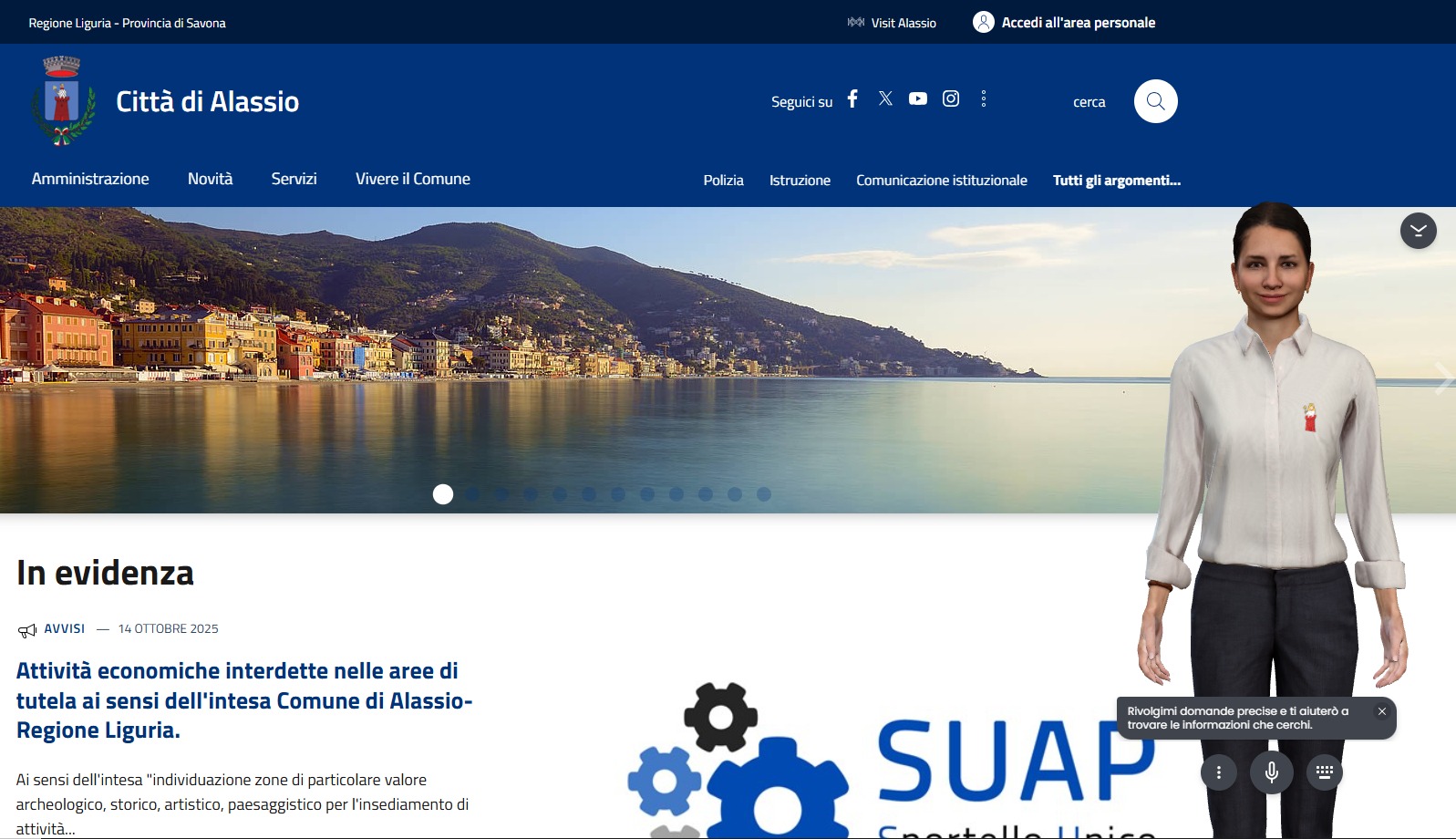 Alassio è il primo comune in Liguria a introdurre un avatar come assistente virtuale sul portale istituzionale