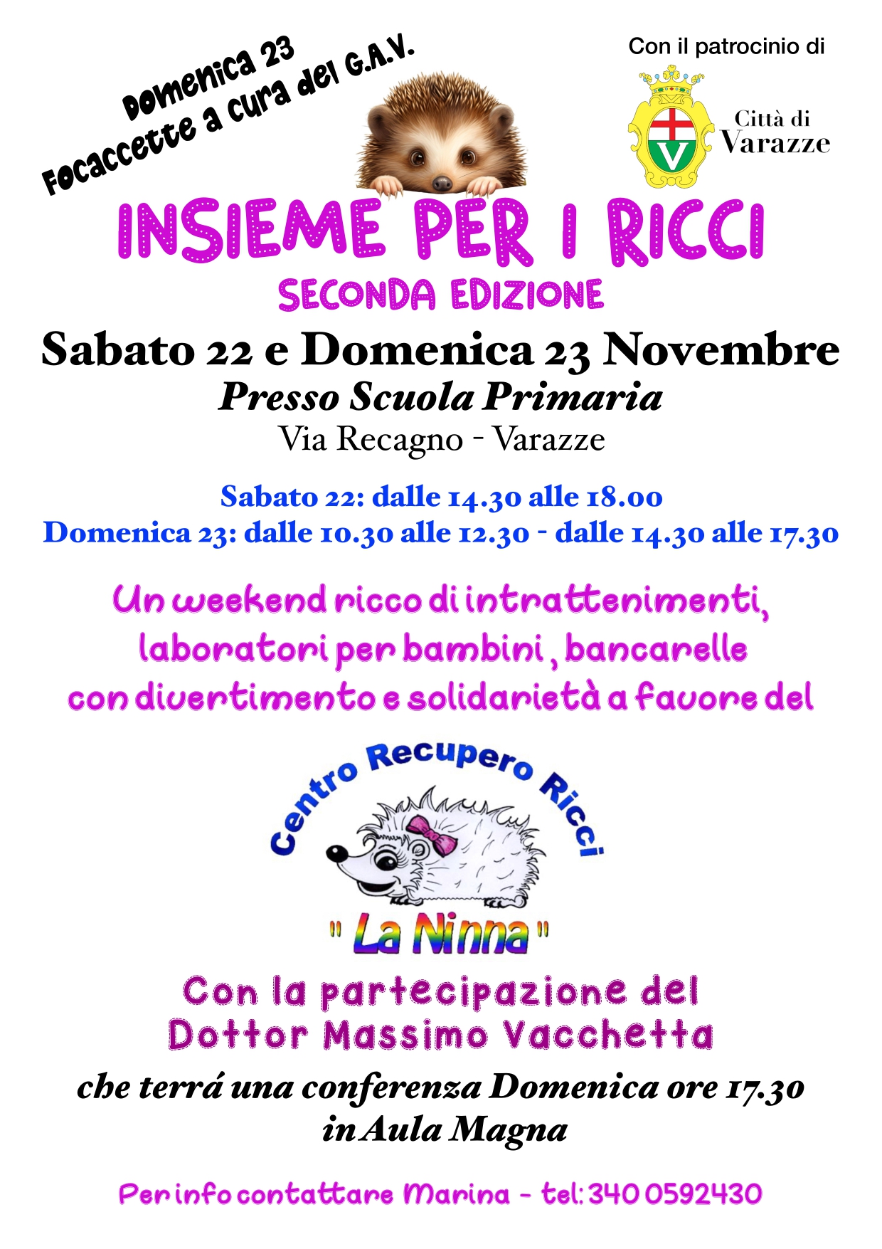 Nel fine settimana Varazze ospiterà “Insieme per i ricci”, un’iniziativa rivolta a bambini, famiglie e a tutti gli amanti della natura. L’evento è promosso dal Centro Recupero Ricci – La Ninna con l’obiettivo di sensibilizzare sulla tutela dei ricci e raccogliere fondi a sostegno delle attività dell’associazione.