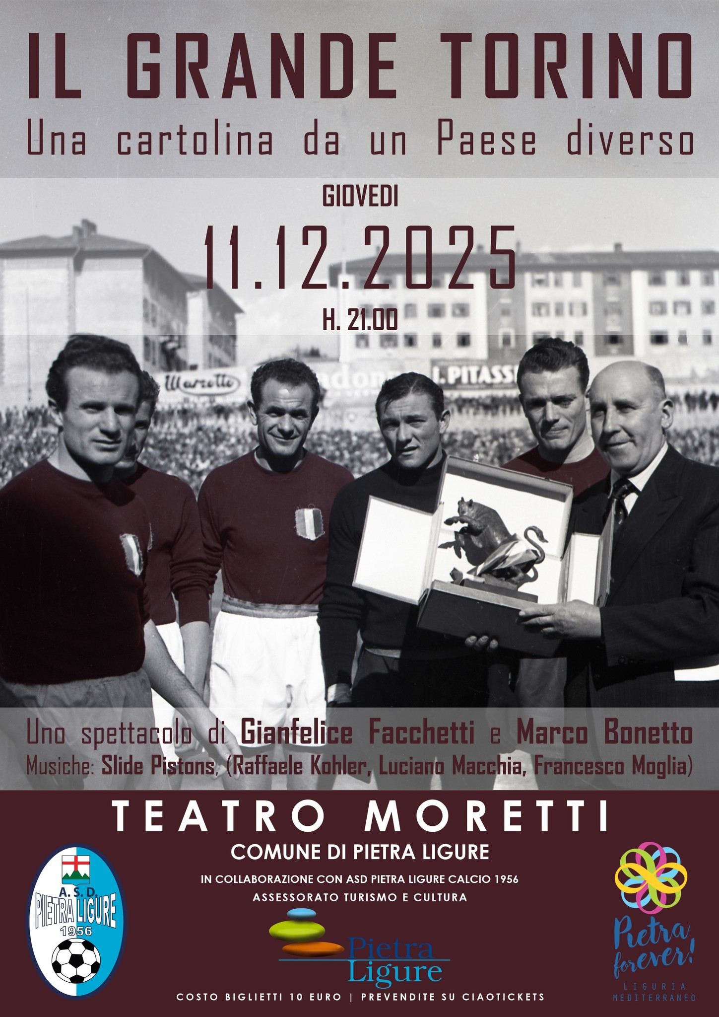 Alle 21 al Teatro Moretti di Pietra Ligure, arriva lo spettacolo “Il Grande Torino” di Gianfelice Facchetti e Marco Bonetto, con Gianfelice Facchetti e le musiche degli Slide Pistons, (Raffaele Kohler, Luciano Macchia, Francesco Moglia). L’evento, patrocinato dal Comune di Pietra Ligure e realizzato con la collaborazione dell’ASD Pietra Ligure”, racconta emozioni, sogni e dolori legati alla squadra di calcio del “Grande Torino” che perì nella tragedia aerea di Superga del 4 maggio 1949. Dopo “Eravamo quasi in cielo” e la “Tribù del calcio”, Gianfelice Facchetti chiude la propria trilogia dedicata allo sport più popolare del mondo, con un racconto teatrale che arriva dopo un podcast realizzato pochi mesi fa per Raiplaysound. Biglietti al costo di 10€, in prevendita su www.ciaotickets.com “Cosa c’è nella valigia di un calciatore che torna da una lunga trasferta o da una sfida memorabile? Quali oggetti, quali cose si conservano sul fondo della borsa? Ci saranno scarpe, indumenti da gioco, una tuta, calzettoni, una fascia da capitano; ci sarà una maglia scambiata con un avversario, mappe per visitare la città dove si è stati, souvenir da portare a chi è rimasto a casa ad aspettare, artigianato locale, una bambola, un barattolo di canfora per ungere i muscoli…Nelle valigie recuperate tra i rottami dell’aereo FIAT G.212 che il 4 maggio 1949 si schiantò su Superga, c’erano tante di queste cose ma anche molto di più: c’erano i sogni ritrovati di una generazione e di un Paese intero, il nostro, che a quella squadra si era aggrappato come si fa con qualcosa di salvifico quando tutto sta andando giù. – spiega Gianfelice Facchetti – Immaginiamo che in quel giorno del ’49 non sia accaduto nulla, nessuna tragedia; spostiamo indietro il calendario e sfogliamo l’album dei ricordi: prima cartolina, seconda, terza, fino a ritrovare le radici e i protagonisti di una pagina di storia rimasta incollata agli occhi della memoria. Nomi, cognomi, luoghi, date. Il “Grande Torino” era una cartolina da un Paese diverso, da un luogo in cui le valigie della gente non contenevano nulla perché erano state svuotate dalla guerra, erano povere e da riempire ancora di tutto: di cose materiali e indispensabili, ma anche di rivalsa, di sogni, di vita. La favola tragica dei ragazzi in maglia granata, parla dei sogni infranti di una generazione che dopo la seconda guerra Mondiale si era rimboccata le maniche e aveva cercato di riprendersi la vita in mille maniere diverse. Una di queste è stata sicuramente lo sport, prima il ciclismo poi il calcio, proprio grazie al Torino che tutti amavano, da nord a sud. C’era fame di vita e di fiducia in qualcosa da cui cominciare a ricostruire. E c’era anche sete di rivincite, di vittorie, di orgoglio calpestato da troppo tempo e finito sotto i piedi. In un quadro rassegnato, fu lo sport a fornire qualche appiglio al Paese intero – continua – Per questo, quando il cielo inghiottì gli “Invincibili” in maglia granata, venne giù tutto; fu un lutto così potente da cancellare ogni slancio di avvenire per tanti italiani. Ricordarlo a 75 anni esatti, vuol dire riannodare i fili del tempo e restituirci un frammento di ciò che siamo stati e, in qualche maniera, vorremmo un po’ tornare ad essere”, conclude Facchetti.