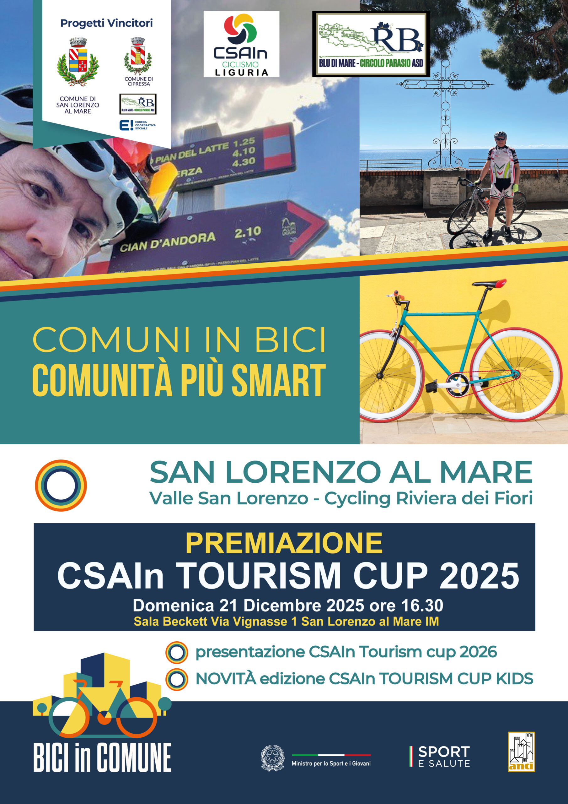 La CSAIn Tourism Cup fa parte del progetto nazionale “Bici in Comune”, bando promosso dal Ministro per lo Sport e i Giovani con il supporto del Dipartimento per lo Sport, tramite Sport e Salute e l’ANCI, vinto dal Comune di San Lorenzo al Mare in partenariato con Cipressa, Associazione Sportiva Dilettantistica Blu di Mare – Circolo Parasio e Eureka Coop. Soc. L’iniziativa promuove mobilità sostenibile, turismo attivo e inclusione attraverso la pratica del ciclismo e la valorizzazione del territorio.