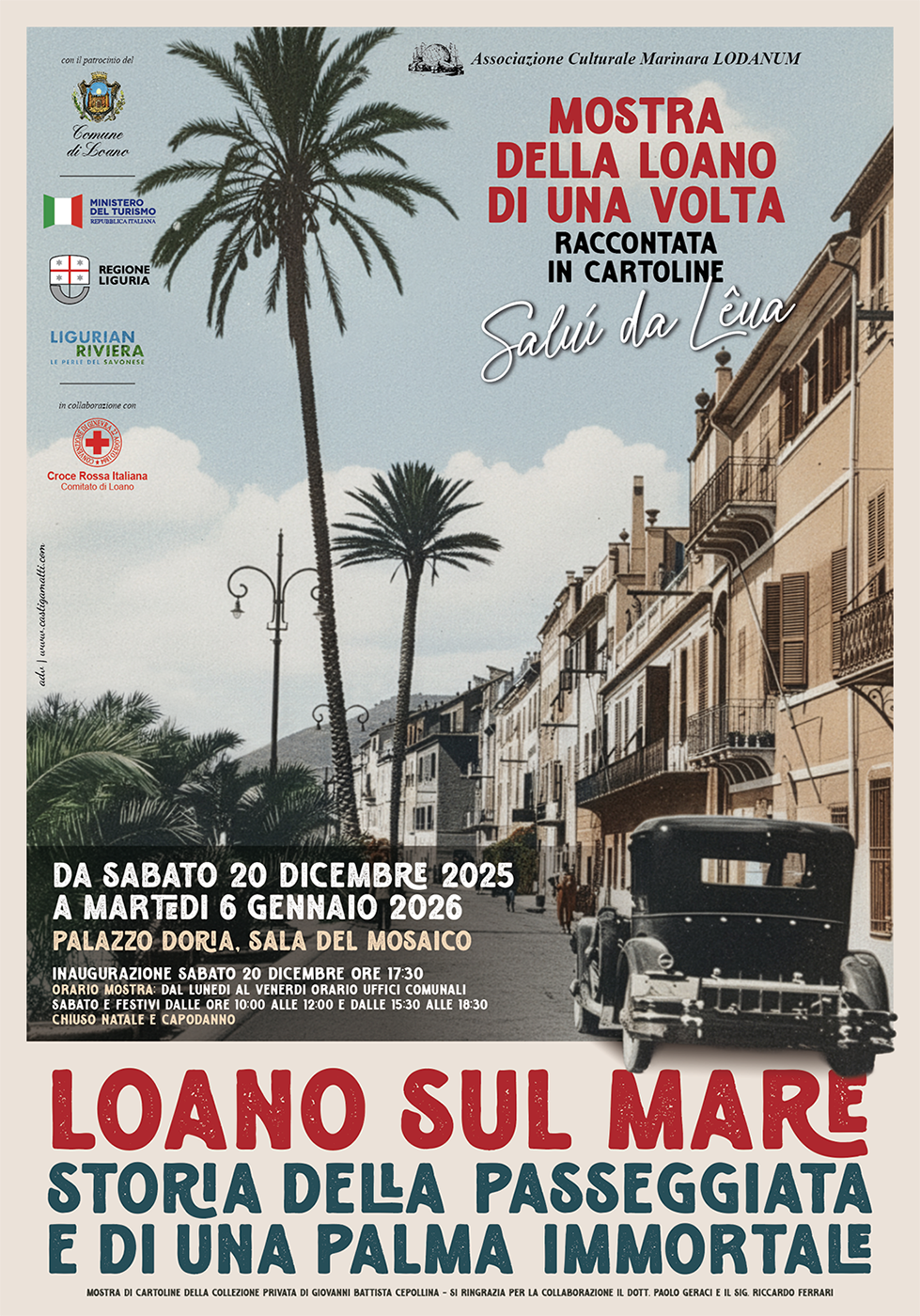 Torna anche quest’anno “La Loano di una volta raccontata in cartoline”, il progetto storico- espositivo elaborato dall’Associazione Culturale Marinara Lodanum con il patrocinio dell’assessorato a turismo, cultura e sport del Comune di Loano, del Ministero del Turismo e della Regione Liguria. La mostra di quest’anno sarà dedicata al rapporto speciale tra la città e il suo affaccio sul mare e si intitola “Loano sul mare. Storia della passeggiata e di una palma immortale”. Sarà un viaggio lungo oltre un secolo tra immagini d’epoca, documenti storici e la straordinaria vicenda della palma Phoenix dactylifera che, con i suoi 28 metri, fu per molti anni la pianta più alta d’Europa fino al suo abbattimento, avvenuto il 29 giugno 1943. Attraverso la forza evocativa delle cartoline, vere finestre sul passato, la mostra racconta come Loano abbia costruito nel tempo il proprio immaginario turistico e urbano, recuperando una memoria condivisa che continua a definire l’identità cittadina. L’esposizione è organizzata in quattro sezioni tematiche, corredate da pannelli illustrativi e da una selezione di cartoline provenienti dalla collezione privata di Giovanni Battista Cepollina, integrate con materiali storici messi gentilmente a disposizione da Paolo Geraci e da Riccardo Ferrari. La prima sezione, dedicata a “Le origini: cantieri, pesca e prime piantumazioni”, racconterà le radici marinare di Loano: i cantieri del Borgo di Dentro, la pesca come attività identitaria e il paesaggio costiero precedente alla nascita della passeggiata. Una sezione dedicata anche alle prime piantumazioni ottocentesche delle palme. La seconda sezione, intitolata “La nascita della passeggiata turistica”, racconterà il passaggio da borgo marinaro a località balneare e racconterà per immagini alcuni momenti fondamentali: la trasformazione della “stradda da màina”; la nascita dei primi stabilimenti balneari; il Kursaal termale e balneare; l’arrivo delle palme Phoenix canariensis negli anni Venti. La terza sezione è intitolata “La palma più alta d’Europa (1818-1943)” ed è dedicata alla Palmalunga dell’orto Maccagli, piantata nel 1818 e divenuta un simbolo della città. Fotografie, cartoline e testimonianze raccontano la storia di questa palma straordinaria, celebre in tutta Italia. Sarà presente anche un approfondimento sulla “rodella” conservata nella Siloteca del Museo di Storia Naturale di Milano. L’ultima sezione si concentrerà su “Il dopoguerra e il boom turistico” e racconterà la rinascita della città: la ricostruzione, il turismo di massa, le nuove architetture del fronte mare e l’evoluzione della passeggiata fino agli anni Sessanta e Settanta. La mostra sarà visitabile dal 20 dicembre 2025 al 6 gennaio 2026 presso la Sala del Mosaico di Palazzo Doria nei seguenti orari: dal lunedì al venerdì negli orari di apertura degli uffici comunali; sabato e nei festivi dalle 10 alle 12 e dalle 15.30 alle 18.30; chiuso il 25 dicembre e il 1^ gennaio. L’inaugurazione è prevista sabato 20 dicembre alle 17.30.