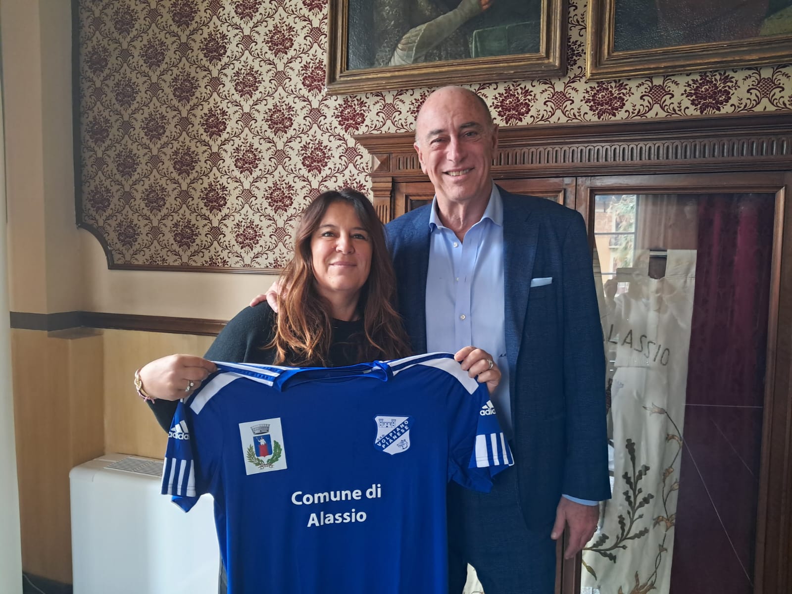 L’assessore allo Sport del Comune di Alassio Roberta Zucchinetti, insieme al sindaco Marco Melgrati, mostra la maglia ufficiale del G.S.D. Volpiano Pianese, realizzata con una dedica speciale al Comune di Alassio e impreziosita dallo stemma della Città. L’occasione di questo gradito omaggio è stata il ritiro giovanile ad Alassio della società – che fa parte del percorso Juventus Training Center – in vista della nuova edizione della Turin Winter Cup. Questo appuntamento di riferimento nel panorama calcistico giovanile nazionale si chiuderà il prossimo 6 gennaio presso lo Juventus Training Center di Vinovo, dove verranno disputate le finali.