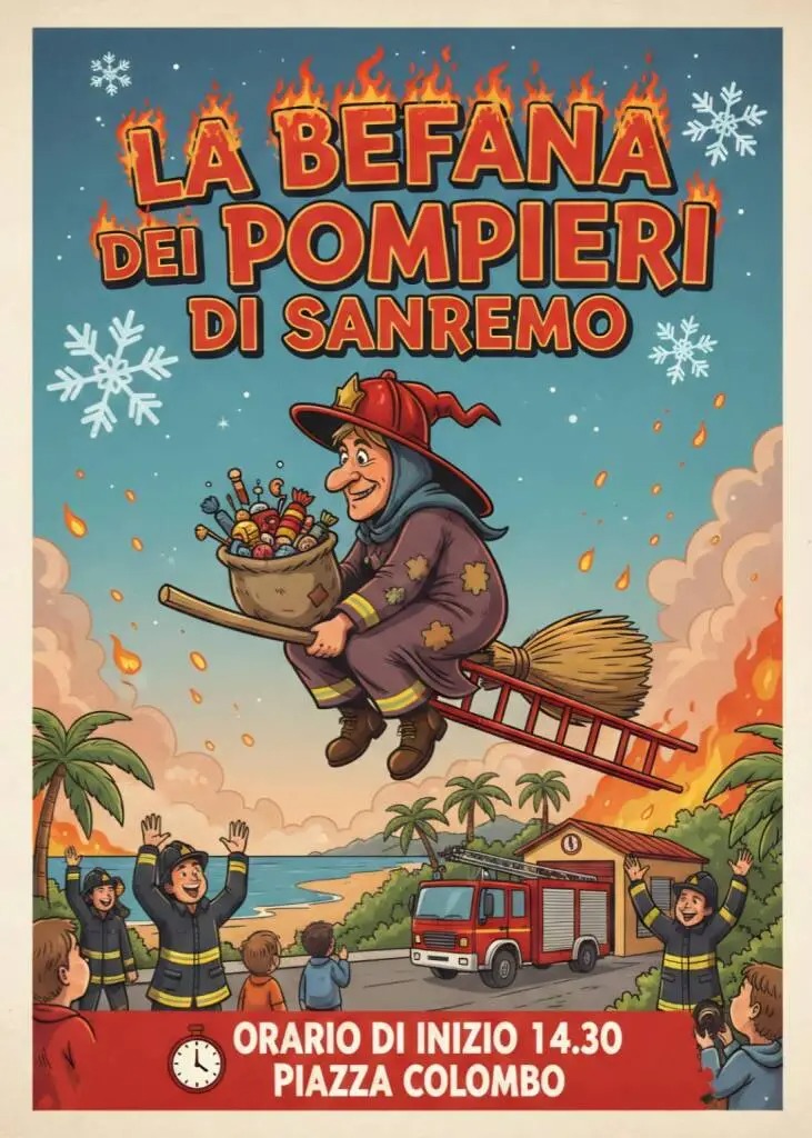 Oggi dalle ore 14.30 circa, si svolgerà presso Piazza Colombo a Sanremo la Befana dei Pompieri. La famosa vecchina sarà accompagnata dai Vigili del Fuoco matuziani in giro per la Città per poi raggiungere la Piazza dove distribuirà caramelle a tutti i presenti.