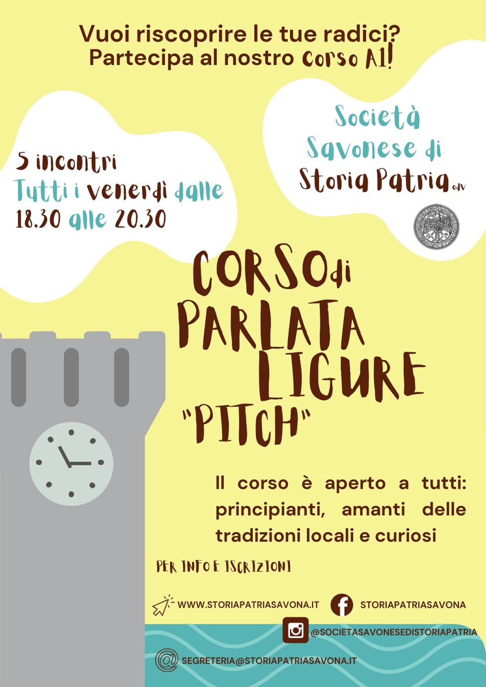 Pitch si tiene nella sede della Società Savonese di Storia Patria (via Pia 14/4, piazza della Maddalena, Savona), dalle 18.30 alle 20.30 al venerdì: 23 e 30 gennaio; 6, 13 e 20 febbraio 2026.