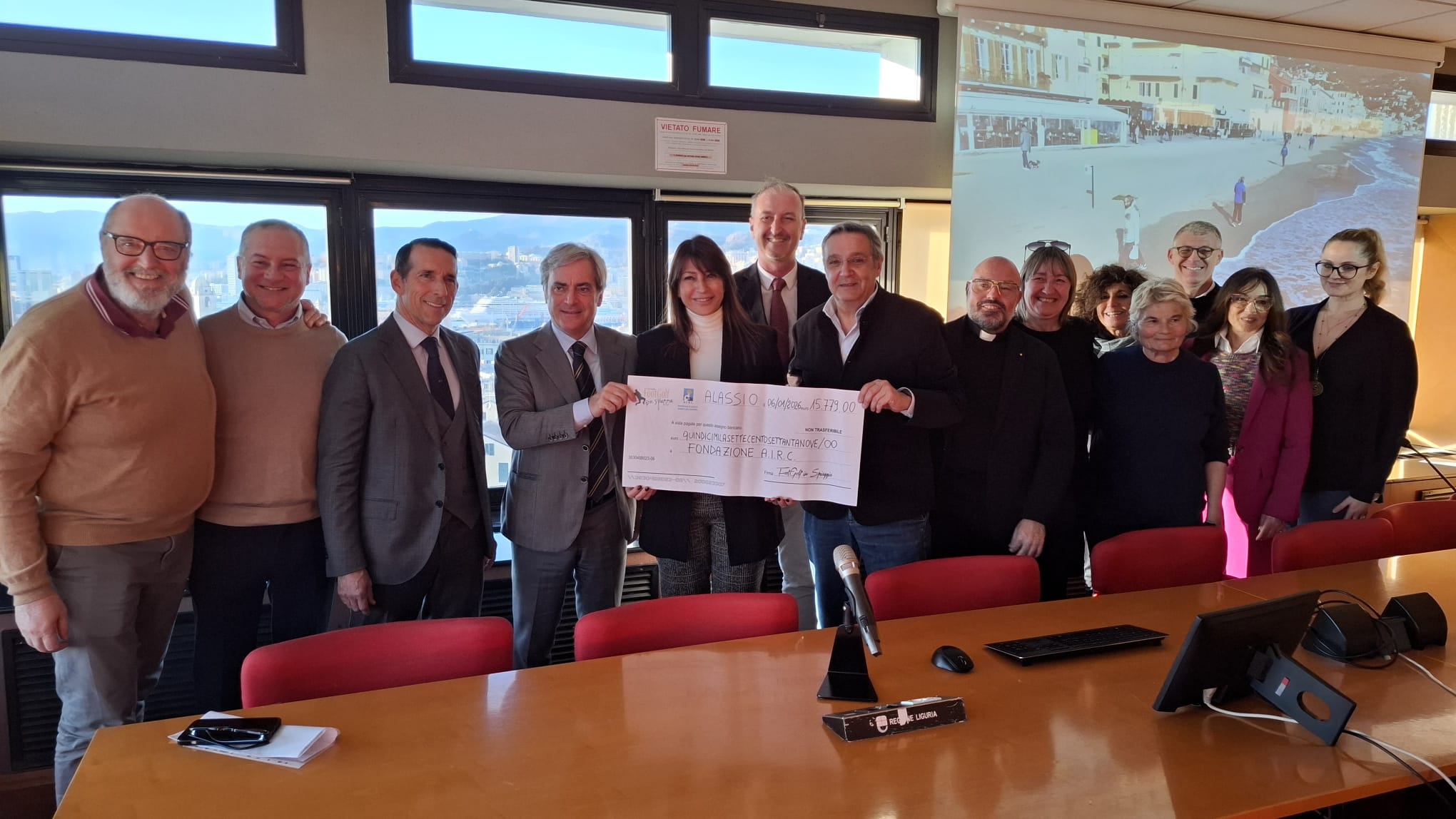 Cerimonia delle grandi occasioni in Regione a Genova con l’organizzazione del Footgolf sulla spiaggia di Alassio che ha consegnato alla Fondazione Airc l’assegno da 15.779 euro, somma raccolta prima, durante e dopo l’edizione 2026 che nel giorno dell’Epifani9a ha visto trionfare l’ex Genoa Mario Bortolazzi e l’ex Bari e Juve Massimo Carrera. Erano presenti Simona Ferro, vice presidente di Regione Liguria con il consigliere regionale Rocco Invernizzi, il vice sindaco di Alassio Galtieri e poi naturalmente delegazione Airc Liguria con il presidente Lorenzo Anselmi e la ricercatrice Irene Caffa.Hanno partecipato anche i rappresentanti del footgolf ligure e don Gabriele Corini, in rappresentanza della associazione Selecao Sacerdoti ed ancora associazioni di categoria alassine e collaboratori dell’evento. “Quello di quest’anno è stato un risultato eccezionale – spiega Marco Dottore, responsabile dell’Agenzia Eccoci Eventi che ha organizzato il Footgolf insieme a Luca Galtieri col contributo del Comune di Alassio, Regione Liguria e Fondazione AIRC– grazie alla fattiva collaborazione di campioni, artisti e attori che hanno trasformato l’Epifania in una giornata memorabile. L’importo record che ha superato quello dell’anno scorso di 12 mila euro è stato raggiunto grazie alla cena di gala andata in scena all’Hotel Regina, ai banchetti Airc durante l’evento, ai versamenti volontari dei cittadini, e soprattutto alle associazioni e commercianti alassini che