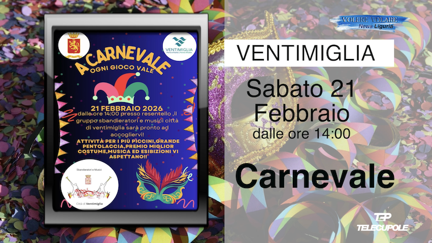Al Resentello di Ventimiglia festa di Carnevale proposta dal gruppo Sbandieratori e Musici Città di Ventimiglia. La 57° edizione del “Carnevale Dianese” a Diano Marina. Carnevale del Golfo a Noli SV con il carnevale dei bambini. A Recco GE “Carleva’ Recchelin”. Il Carnevale a Chiavari con la tradizionale sfilata di carri, maschere musica e divertimento. Carnevale 2026 a Santo Stefano d’Aveto con la spettacolare sfilata dei carri allegorici e dei gruppi mascherati. La storia delle trofie raccontata con la consueta maestria dal giornalista Stefano Pezzini. A Moneglia il tuffo per il cimento e il Carnevale della Zucca. Un artista ligure divenuto famoso all’estero a sua insaputa…. per che cosa? Scopriamolo grazie a Giacomo Aicardi.