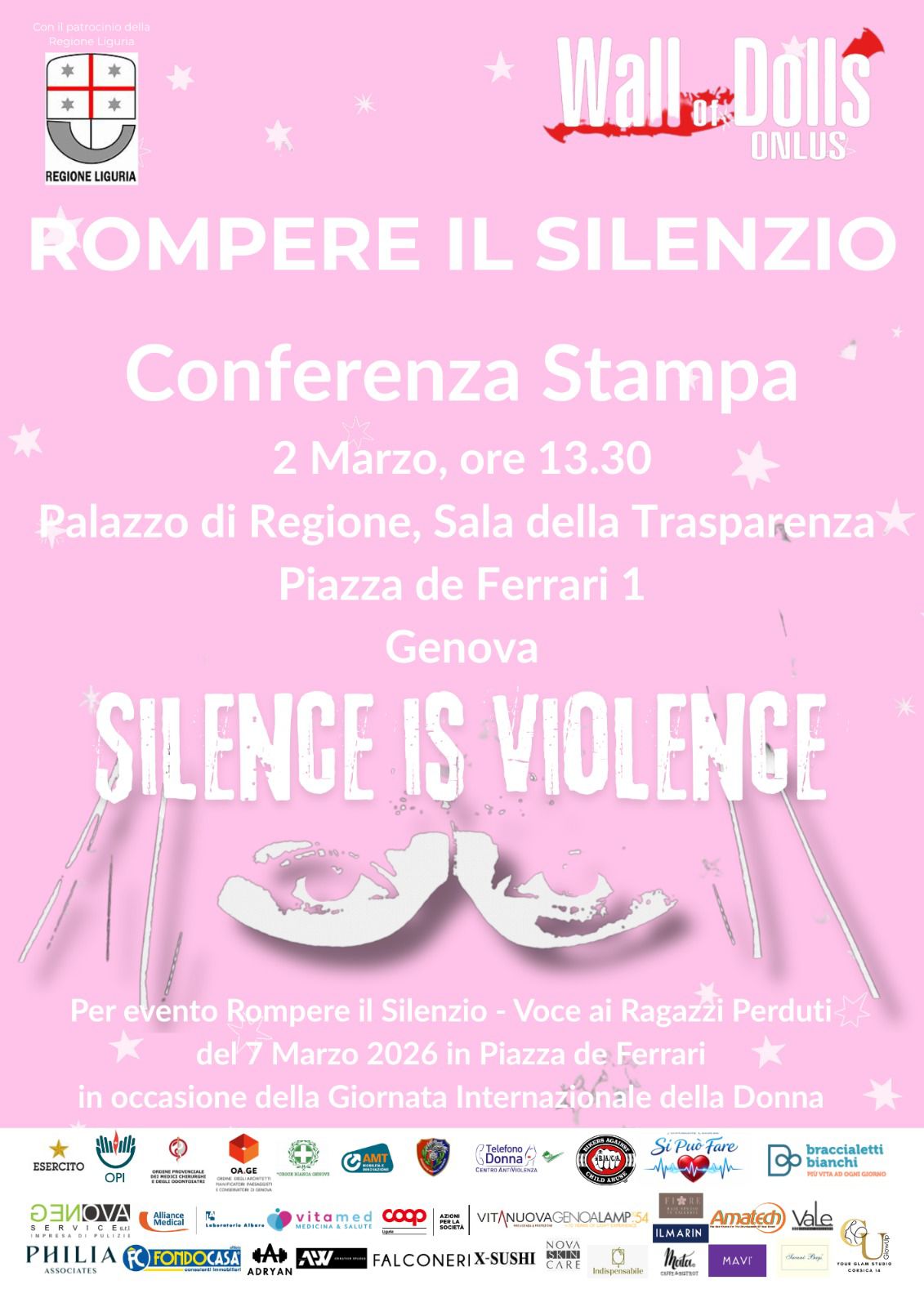 In occasione della giornata internazionale della Donna, il 7 marzo 2026, dalle ore 14, in Piazza De Ferrari, si svolgerà l’evento “Silence is violence” a cura dell’associazione Wall of Dolls, quest’anno dedicato ai ragazzi di Crans Montana. Parteciperanno Jo Squillo, Fondatrice dell’Associazione, Francesca Carollo, Presidentessa dell’Associazione. Con loro sul palco la giornalista Jessica Nicolini e Liliana Ruocco, che si alterneranno nel presentare il programma, e Alexandra Salina, ambassador dell’associazione e content creator. Previsto anche un DJ Set con Massimo Gallesio e Boss Lady Vy. La manifestazione è patrocinata da Regione Liguria, Comune di Genova e anche dall’Ordine.