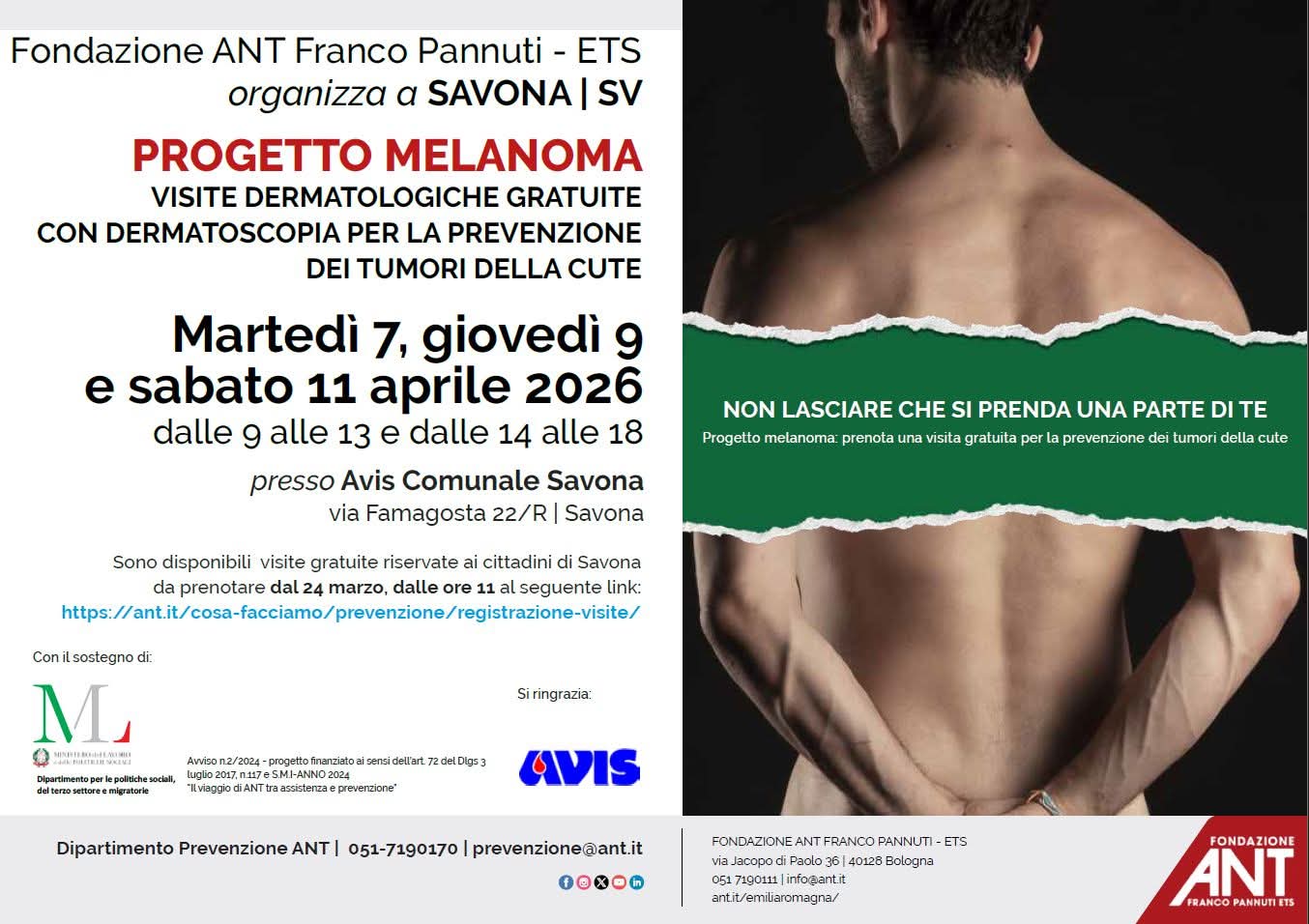 Fra il 7 e l’11 aprile, cinque giornate di visite gratuite di prevenzione dei tumori della cute a Savona e Celle Ligure ‘Il viaggio di ANT tra assistenza e prevenzione’, progetto che gode del finanziamento concesso dal Ministero del Lavoro e delle Politiche Sociali Avviso N.2 /2024, farà tappa anche nella Liguria occidentale, portandosi dietro ben cinque giornate di controlli diagnostici gratuiti inseriti nel ‘Progetto Melanoma’. Nello specifico, gli specialisti ANT in neoplasie della cute saranno ospitati nelle sedi AVIS di Savona (martedì 7, giovedì 9 e sabato 11 aprile dalle 9 alle 13 e dalle 14 alle 18) e di Celle Ligure (mercoledì 8 e venerdì 10 aprile dalle 9 alle 13 e dalle 14 alle 18), site rispettivamente in via Famagosta 22/R e al civico 5 di via S.S. Giacomo e Filippo. Qui, saranno erogate 24 visite dermatologiche con ausilio di dermatoscopia al giorno, 12 la mattina e 12 il pomeriggio, finalizzate alla diagnosi tempestiva di lesioni sospette e/o neoplastiche. Tutte inserite nei finanziamenti del progetto ministeriale e in un ben più ampio Progetto Melanoma che in 21 anni ha contato 206.684 visite gratuite offerte in 91 province italiane, con 18.916 asportazioni consigliate. Per info e prenotazioni, fino a esaurimento posti, da oggi è aperto il portale dedicato al link https://ant.it/prevenzione/.