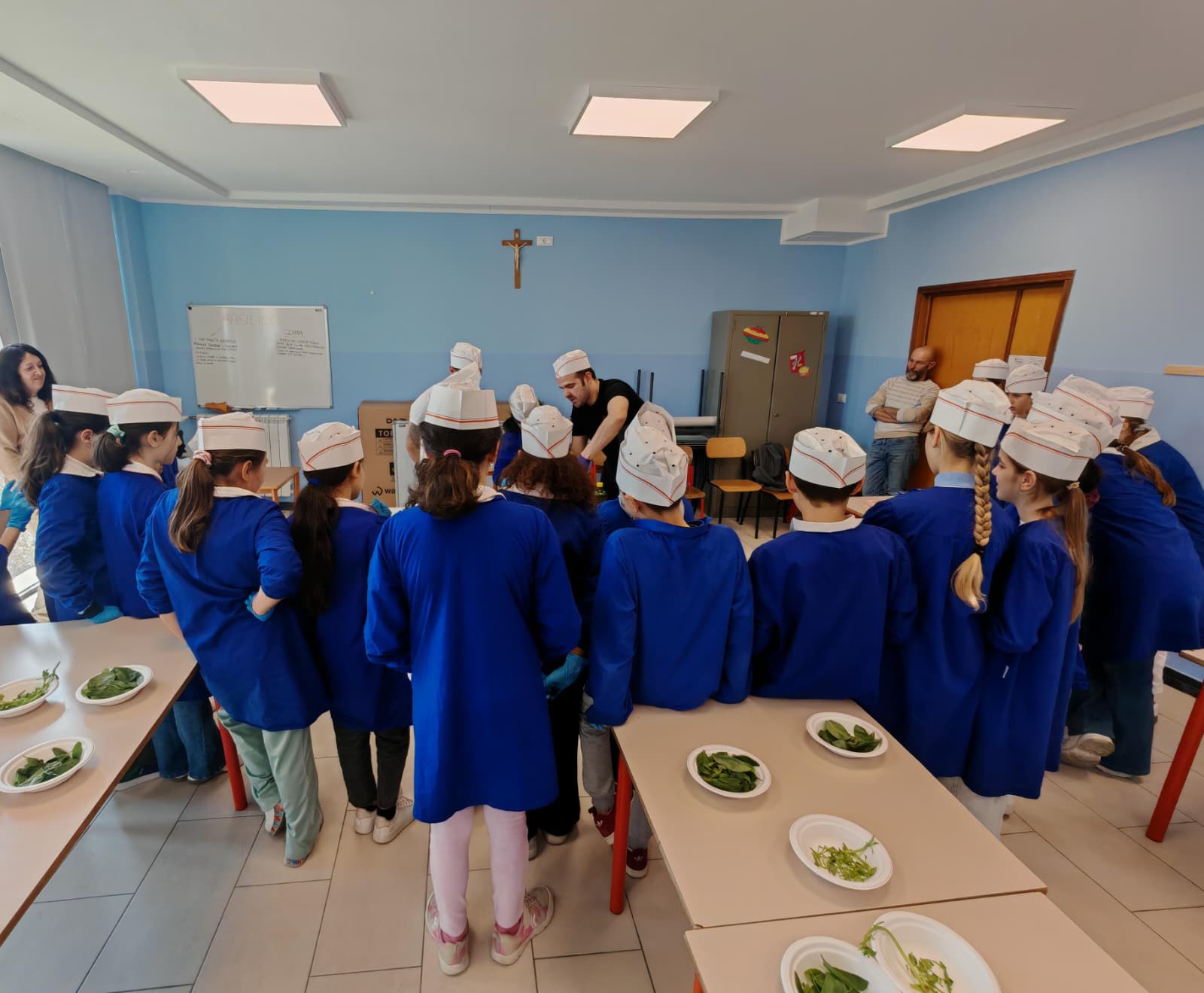 Con impegno e curiosità, i piccoli chef hanno pestato, mescolato e dosato, trasformando foglie e chicchi in una salsa densa e profumata. È stato un esercizio di pazienza e coordinazione che ha trasformato la classe in una vera brigata di cucina.